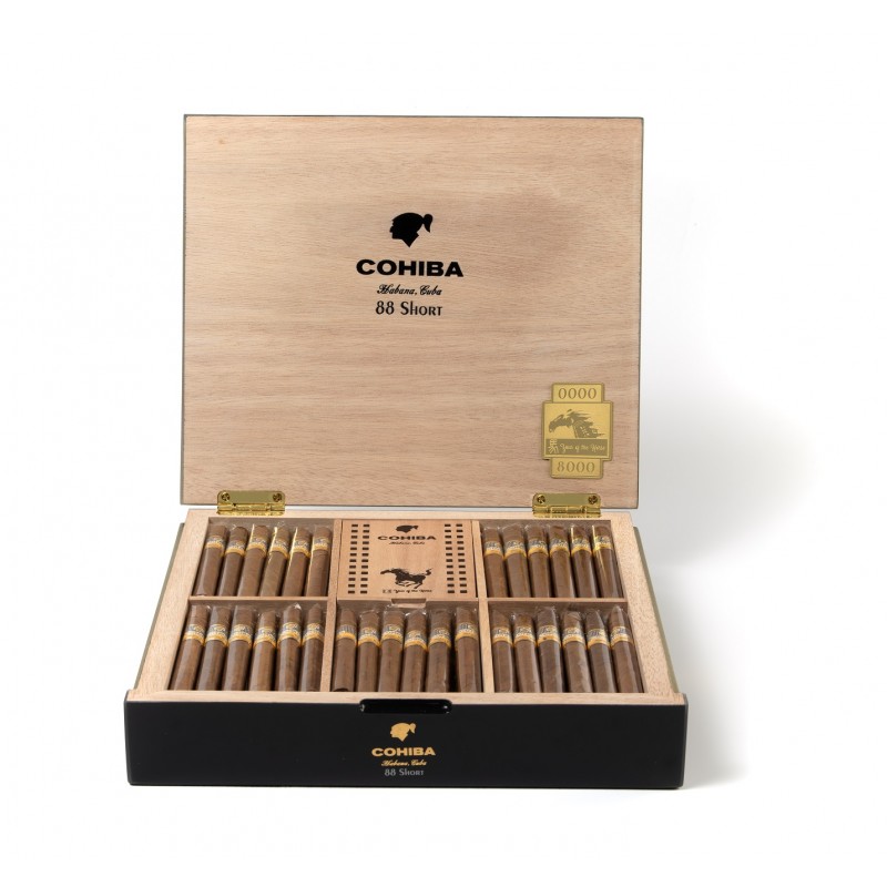 The Cohiba Short Humidor – Year of the Horse 2026 celebrates the Lunar New Year with an impressive collector's edition. These compact, hand-rolled Cohiba Short cigars are crafted from premium Cuban tobacco and wrapped in a natural wrapper. They are medium-bodied and offer rich notes of cocoa, cedar, roasted tobacco, and sweet spices. Presented in a magnificent anniversary humidor containing 88 cigars, this edition is both a festive decorative piece and a refined experience for cigar aficionados.